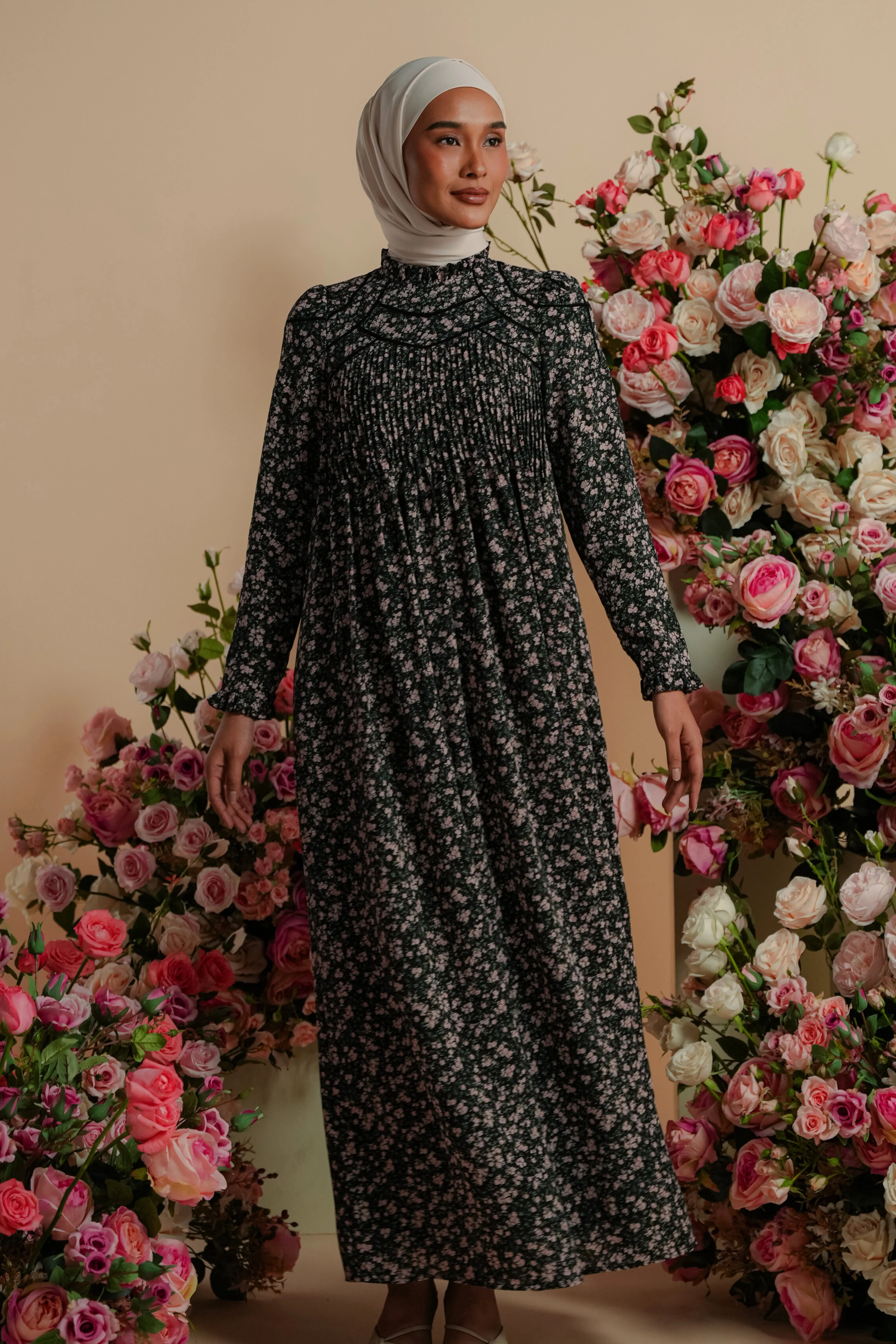 Inspired by the romance of quiet mornings and the elegance of timeless silhouettes, the Jannah Dress in Midnight is a study in vintage florals and thoughtful details. The delicately pleated yoke and bodice creates a soft, flowing shape that flatters and moves effortlessly with you. A bouquet of petite blooms, set against a deep black backdrop, feels both nostalgic and modern, evoking memories of wandering through flower-laden paths. The long sleeves and high neckline nod to graceful femininity, while side pockets bring a touch of practical ease to this dreamy piece. Whether worn barefoot in the garden or paired with a favourite pair of heels, the Jannah Dress in Midnight envelops you in a sense of quiet beauty and timeless charm, perfect for any occasion.